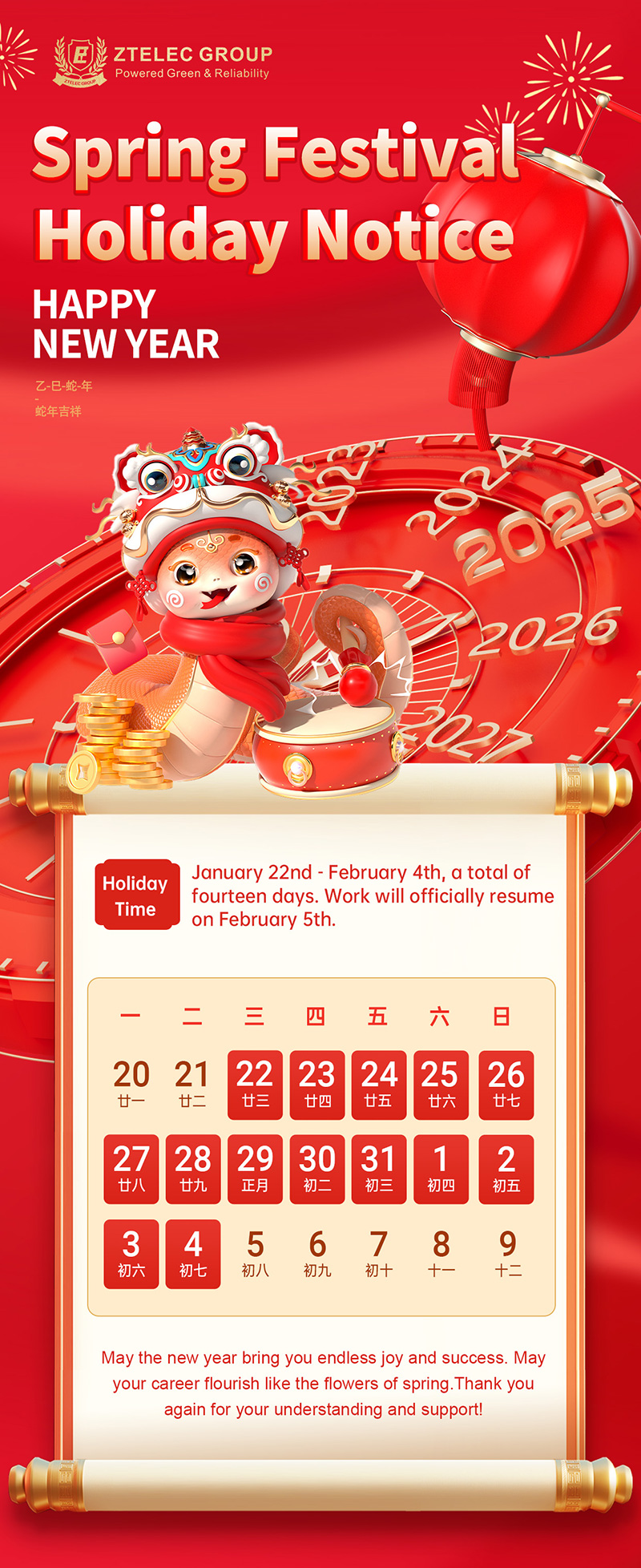 The Spring Festival, a traditional Chinese festival that symbolizes reunion and new hope, is approaching. Here, all the employees of ZTelecgroup extend their most sincere holiday greetings to you and thank you for your continued support and trust in our company.